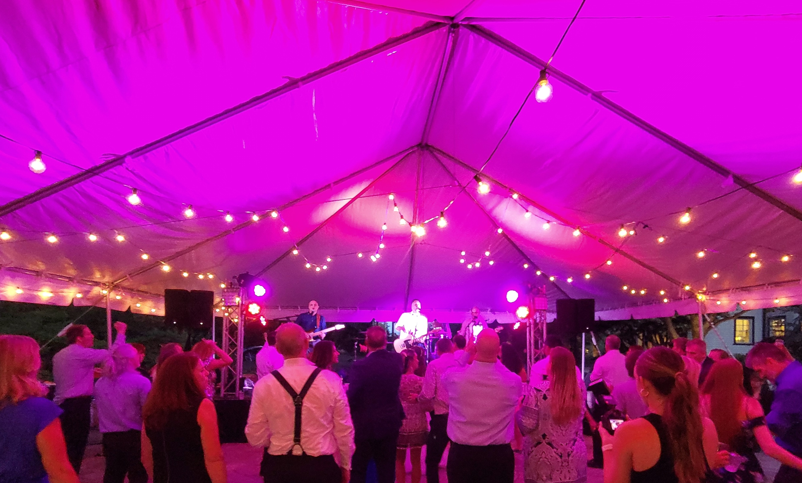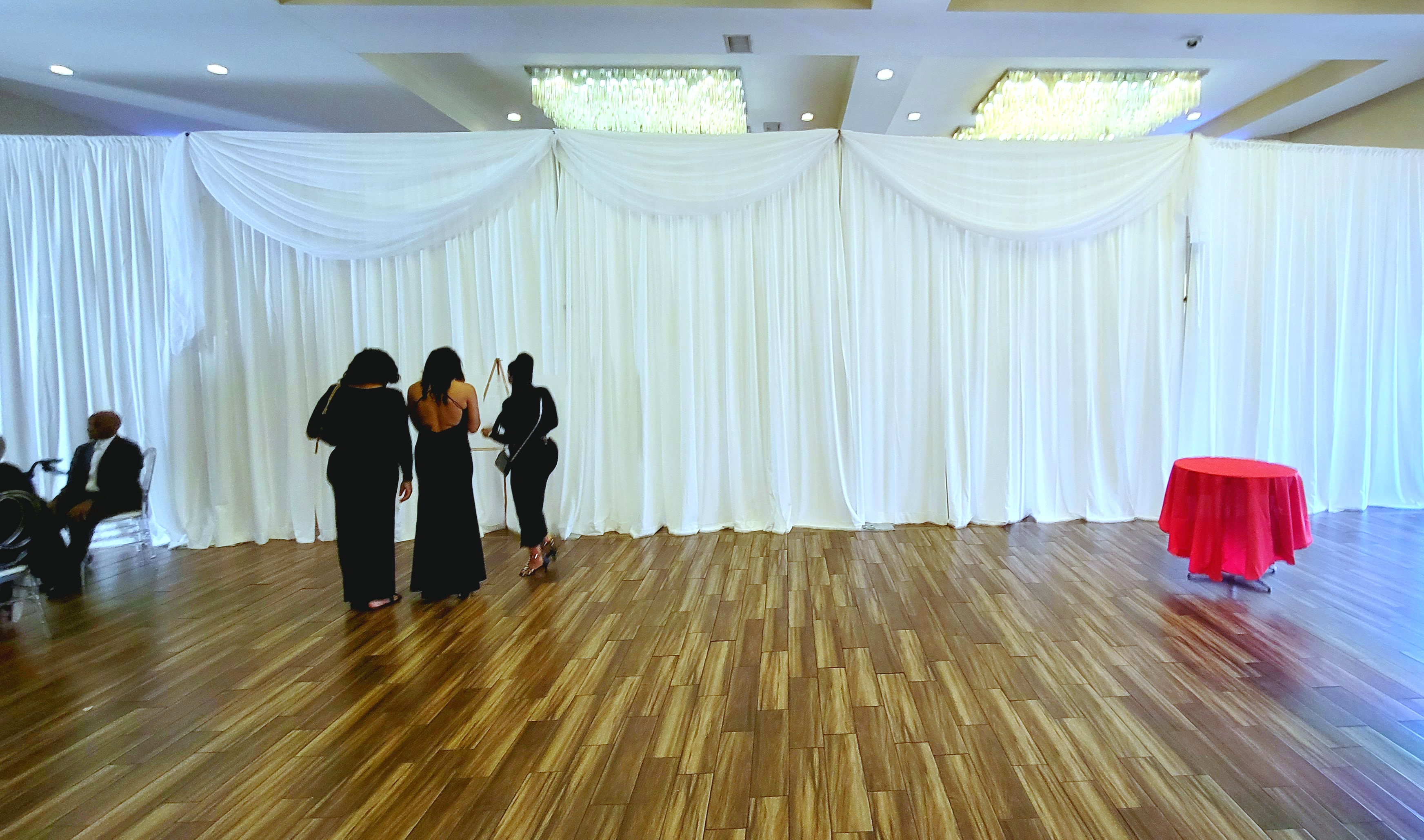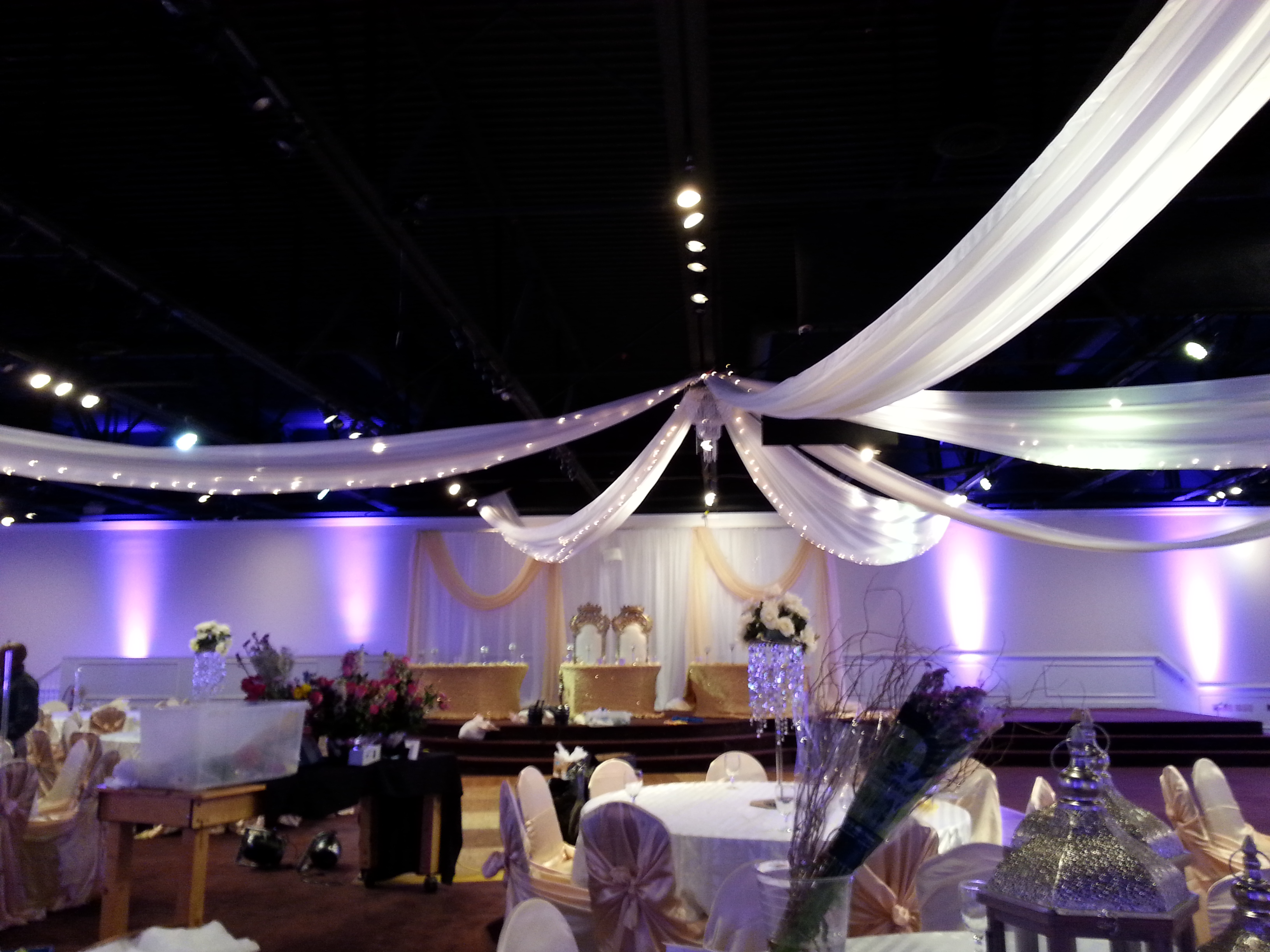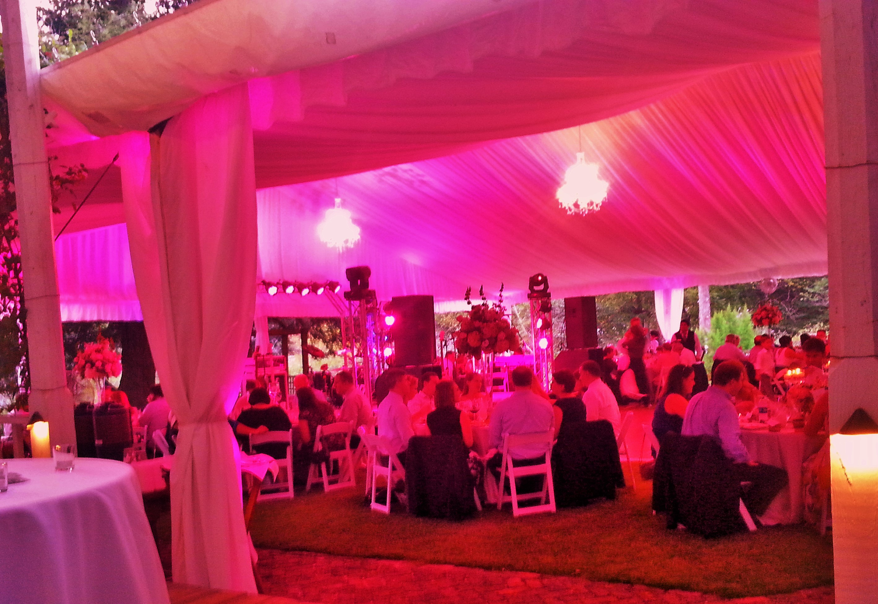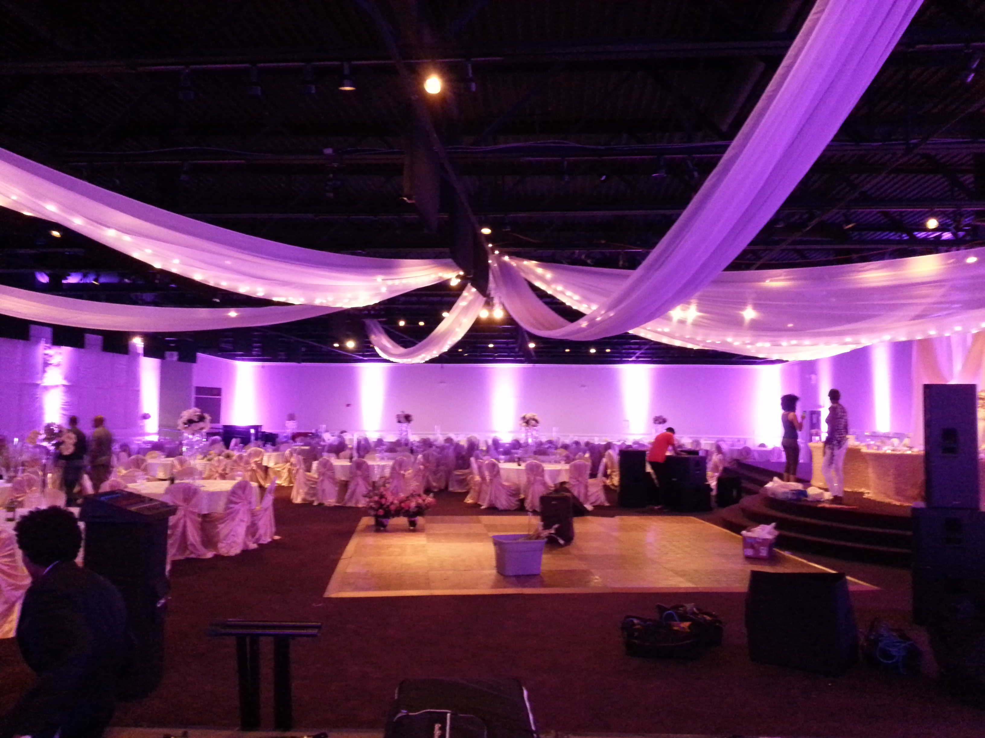Heavy duty stage decks in 4×4 sections – Café style string lights – Fairy String lights in 2 different styles – String light curtains – Twinkle lights – Christmas style lights with white strands – Band stage – Dance floors in both wood and Snaplok Vinyl – Up lighting options – Pipe and Drape – Sheers – “Dancing in the Clouds” dry ice machine – Cold Sparks – Stage Lighting – Ceiling Sheers in white and black – Gobo monogram lighting – Sweetheart stage