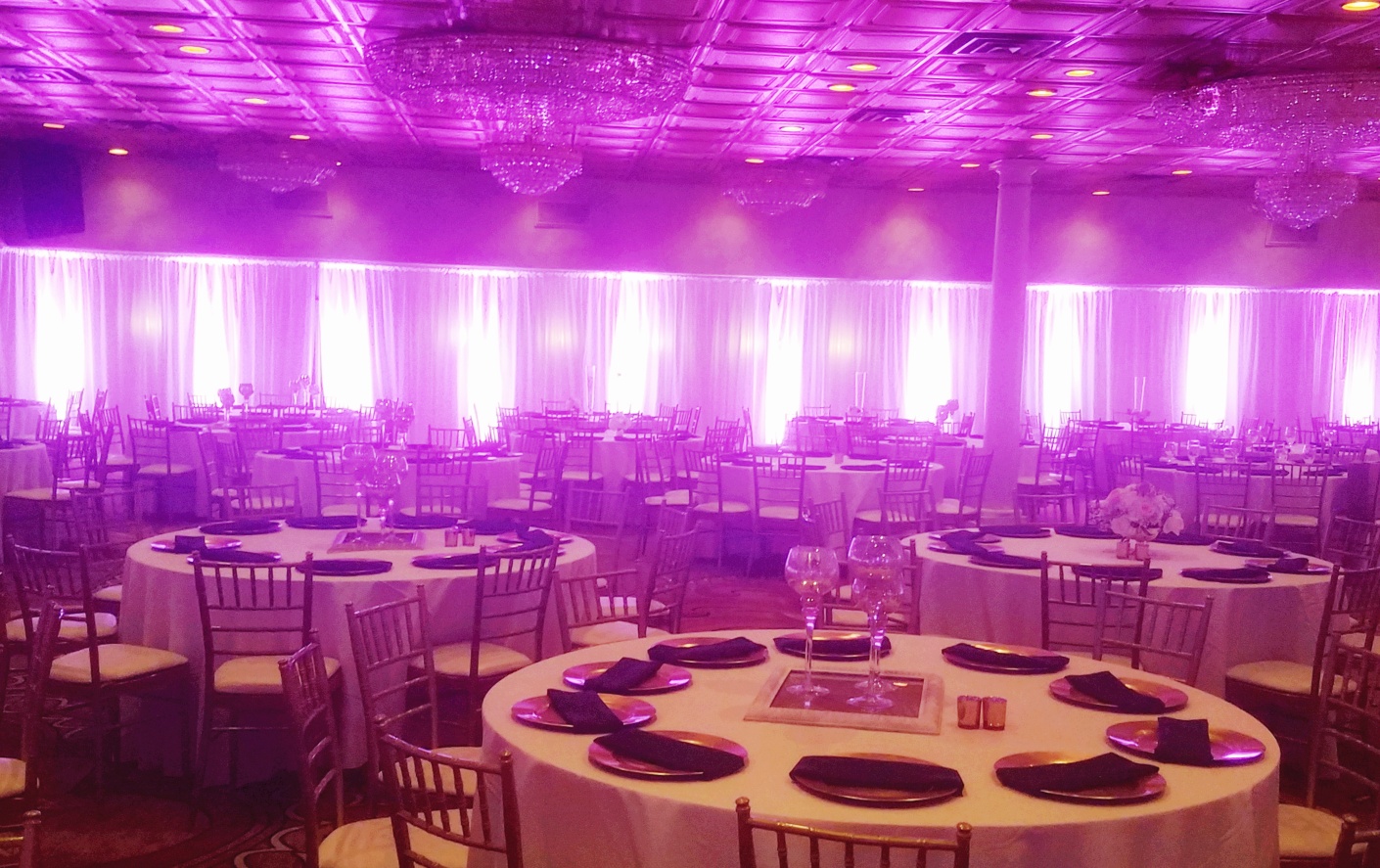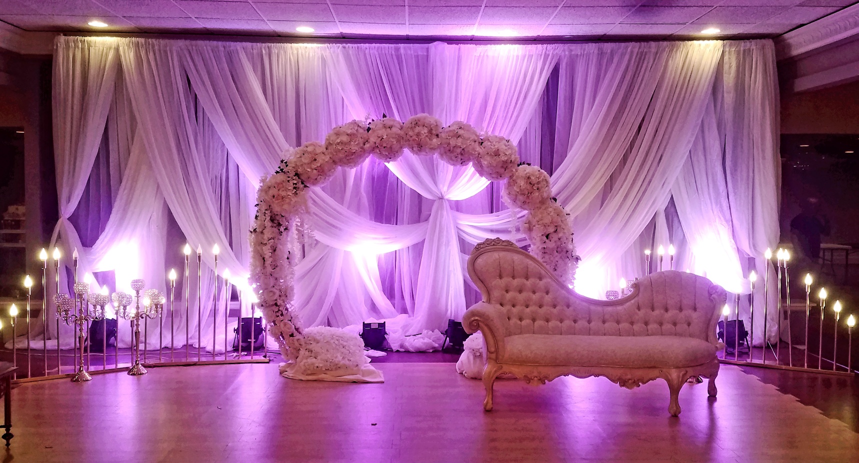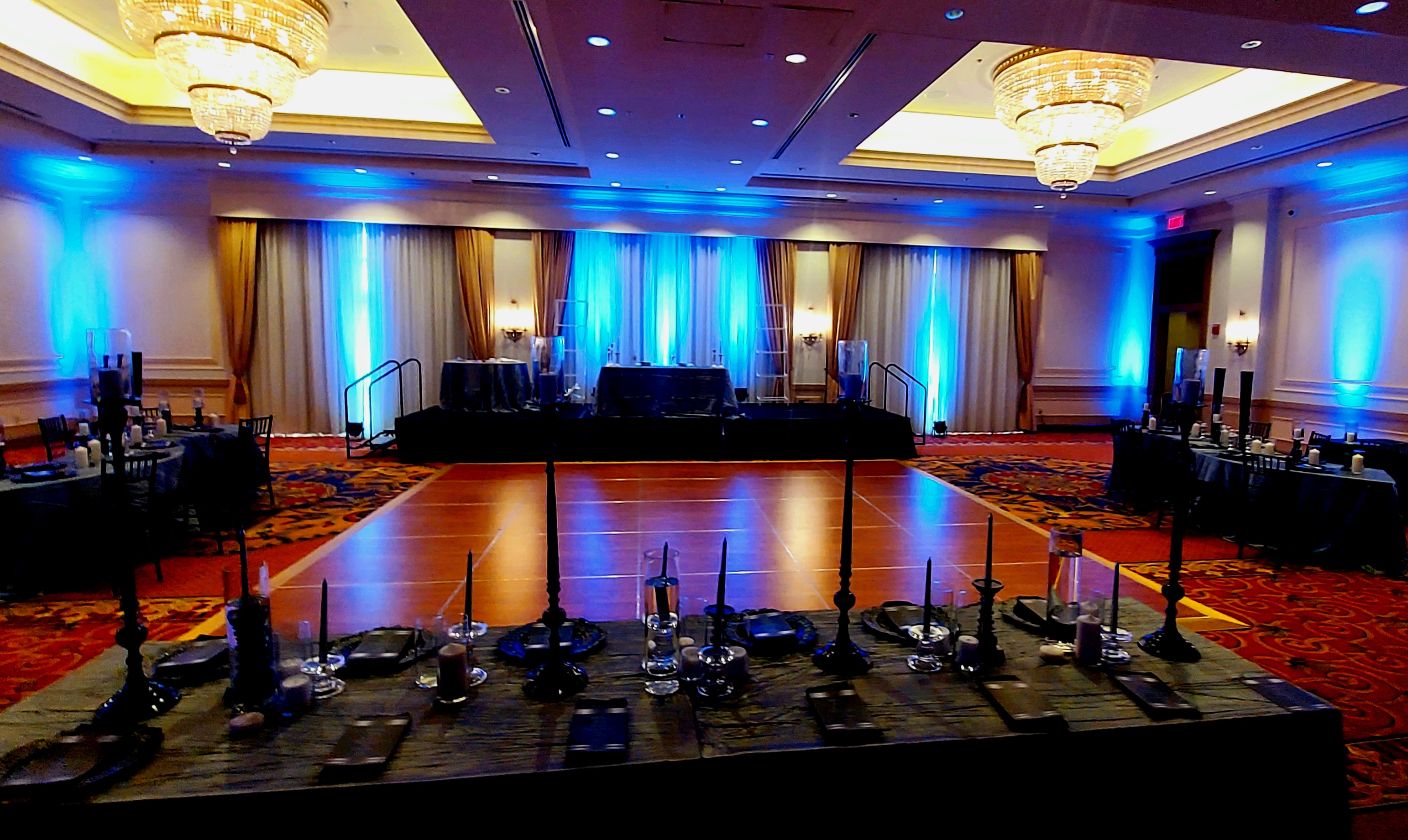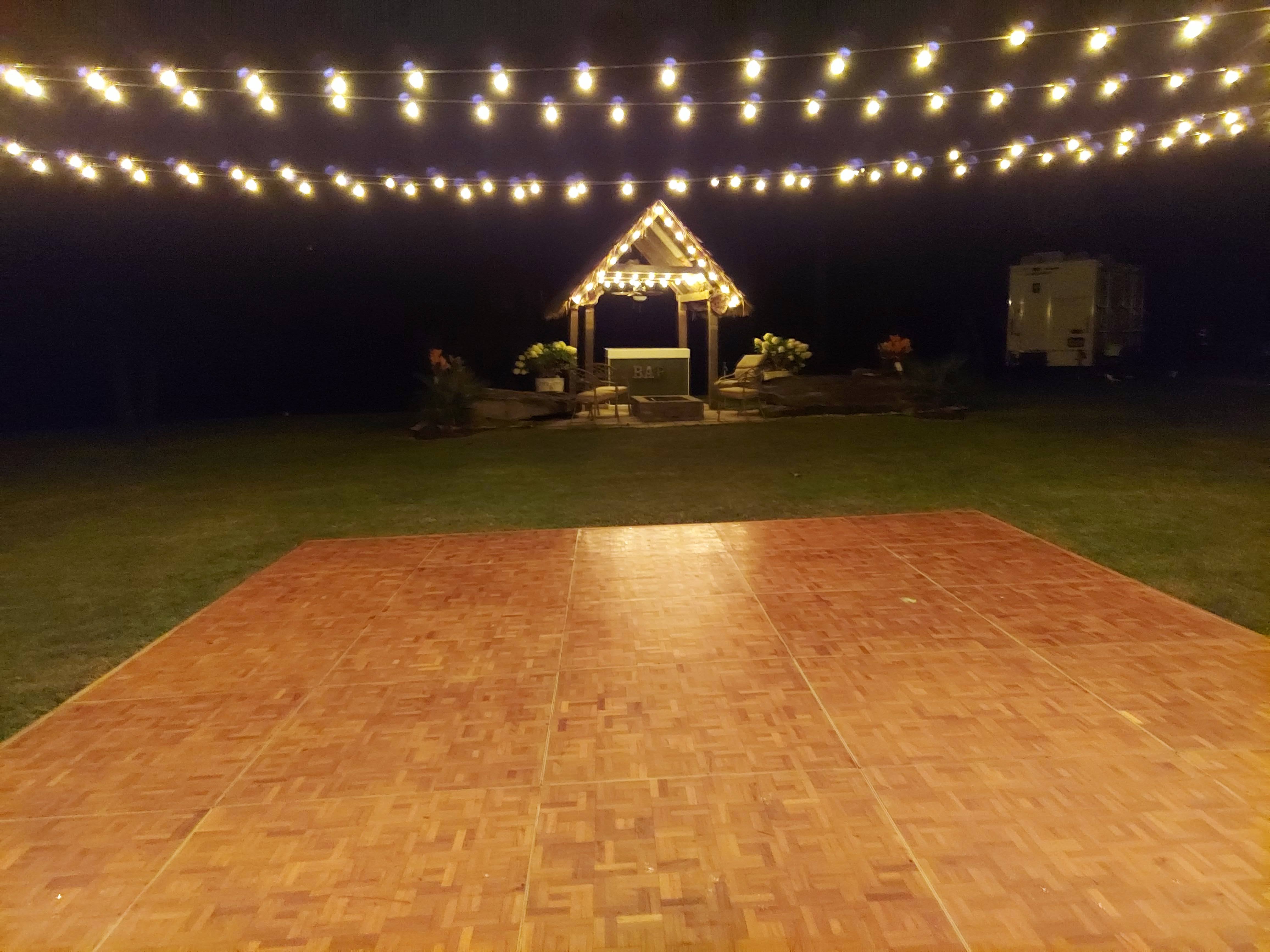 Heavy duty stage decks in 4×4 sections – Café style string lights – Fairy String lights in 2 different styles – String light curtains – Twinkle lights – Christmas style lights with white strands – Band stage – Dance floors in both wood and Snaplok Vinyl – Up lighting options – Pipe and Drape – Sheers – “Dancing in the Clouds” dry ice machine – Cold Sparks – Stage Lighting – Ceiling Sheers in white and black – Gobo monogram lighting – Sweetheart stage